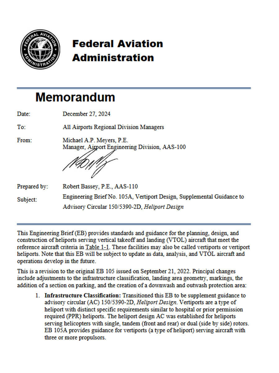 Engineering Brief No. 105A provides updated design standards and guidance for vertiports, which are facilities serving vertical takeoff and landing (VTOL) aircraft. The brief applies to VTOL aircraft with 3+ propulsors, pilot on board, operating under visual flight rules. It aims to support initial vertiport infrastructure development as the FAA transitions to performance-based design criteria. The guidance will be updated as more data on VTOL aircraft performance becomes available.